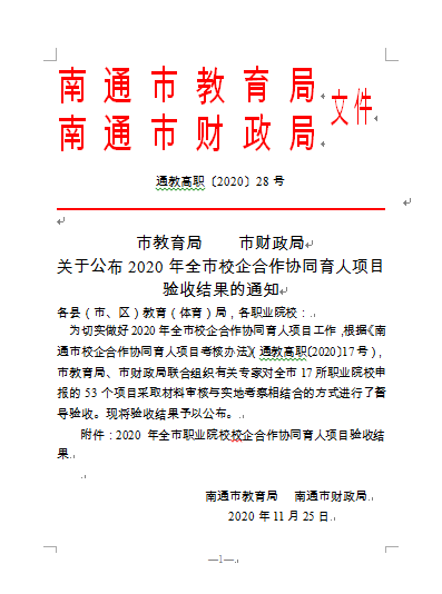 2020年11月25日,市教育局、市财政局联合组织有关专家对全市17所职业院校申报的53个项目采取材料审核与实地考察相结合的方式进行了督导验收,机电工程系校企合作协同育人项目获得验收通过。