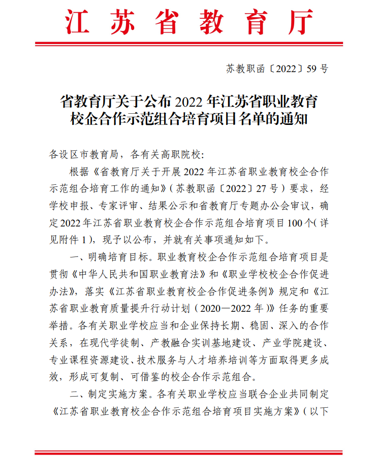 12月5日,省教育厅发布《关于公布 2022 年江苏省职业教育校企合作示范组合培育项目名单的通知》【苏教职函〔2022〕59 号】,获悉如东中专“中奥联合学徒培养项目”入选江苏省职业教育校企合作示范组合培育项目。
