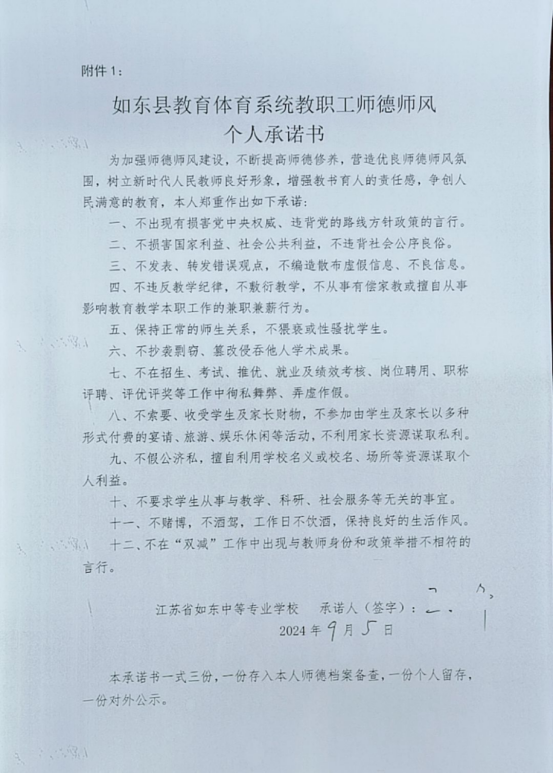 2024年9月6日,在这金秋送爽的下午,机电工程系331教室济济一堂,大家共同学习东教体人【2024】23号文件,开展了师德师风教育活动,每位教师认真地学习了师德师风个人承诺书上的十二条,并郑重地签上自已的名字。
