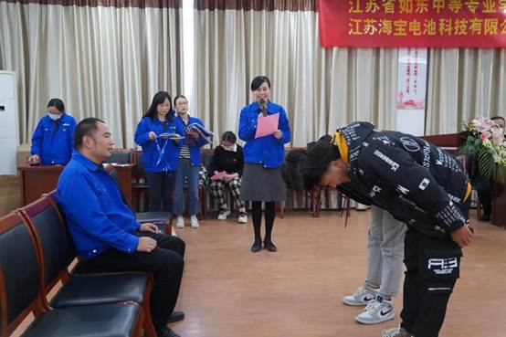 近年来,如东分院大力加强校企合作,深化产教融合,全面推进现代学徒制试点工作,学生“招生即招工,学徒即员工,入校即入企”,既实现了技能传承,又服务了地方经济发展,为如东争当沿海高质量发展排头兵,培养了大批建设者和技术管理人才。此次活动,邀请了如东经济开发区、县教体局、如东分院、江苏海宝电池的有关领导以及学生家长,一起见证如东分院机电工程系2017级高职班19名学徒的拜师仪式。