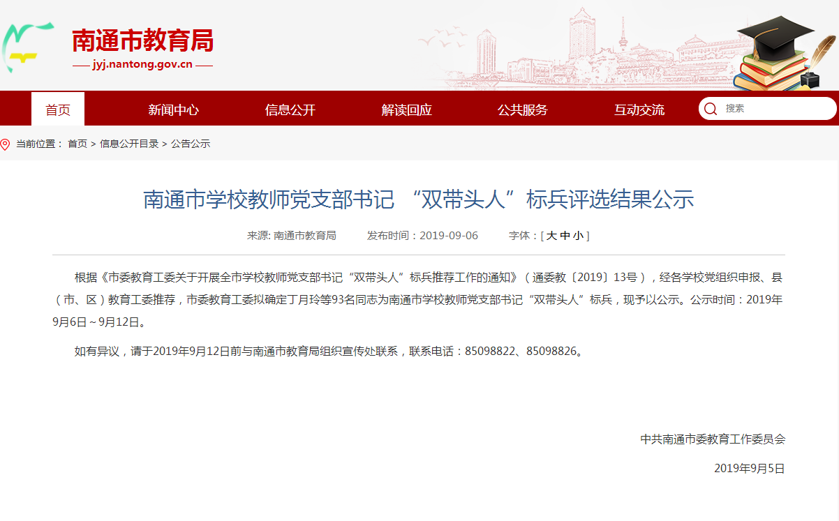 根据《市委教育工委关于开展全市学校教师党支部书记“双带头人”标兵推荐工作的通知》(通委教〔2019〕13号),经各学校党组织申报、县(市、区)教育工委推荐,市委教育工委确定93名同志为南通市学校教师党支部书记“双带头人”标兵。我校副校长陈建同志成功当选。